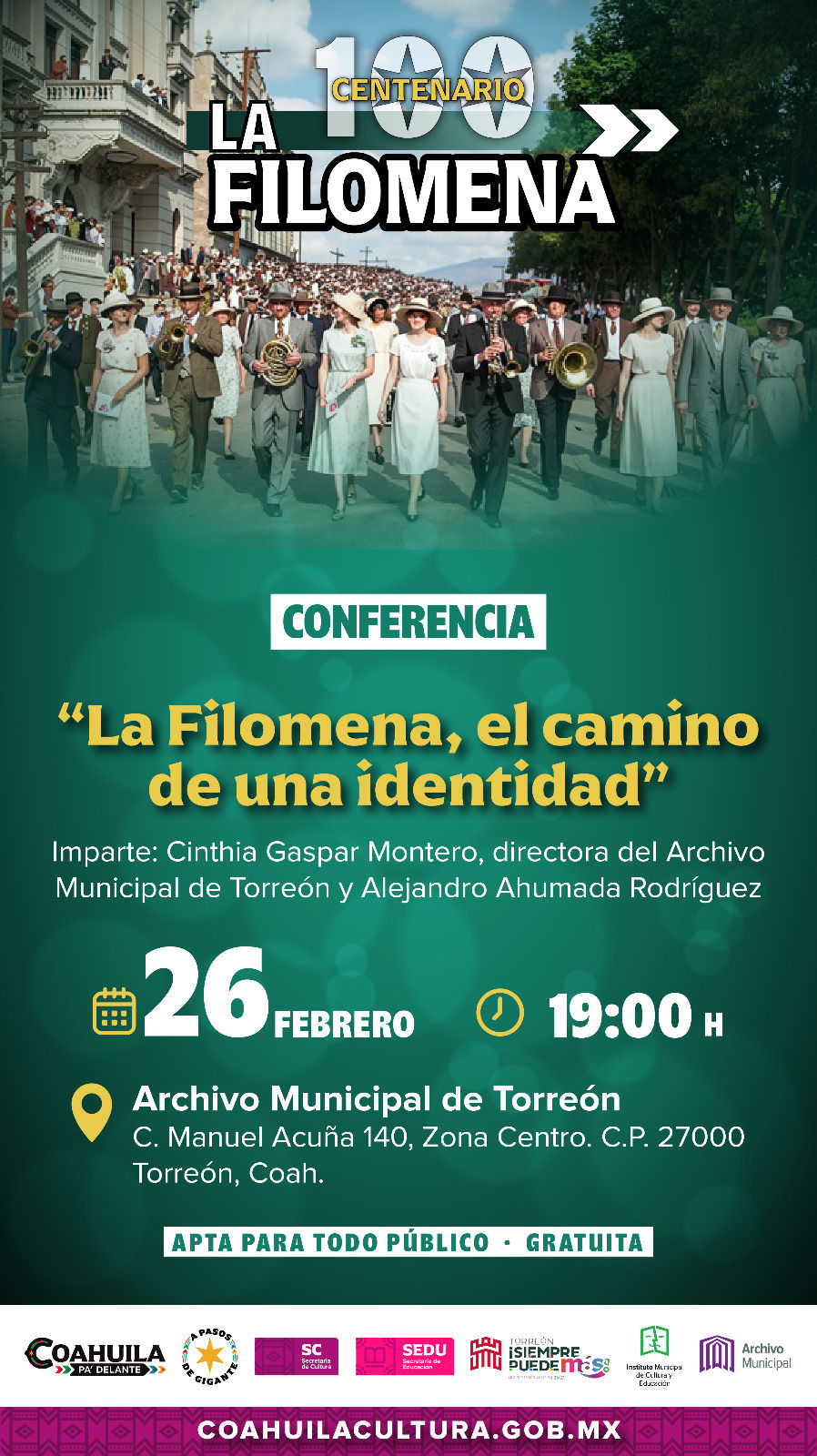 Torreón, Coahuila a 24 de febrero de 2026.- En el marco del centenario de “La Filomena”, el Archivo Municipal, en conjunto con la Secretaría de Cultura de Coahuila y en coordinación con diversas instituciones educativas y culturales, invita cordialmente a la conferencia “La Filomena. El camino de una identidad”, que se llevará a cabo el próximo jueves 26 de febrero a las 19:00 horas.